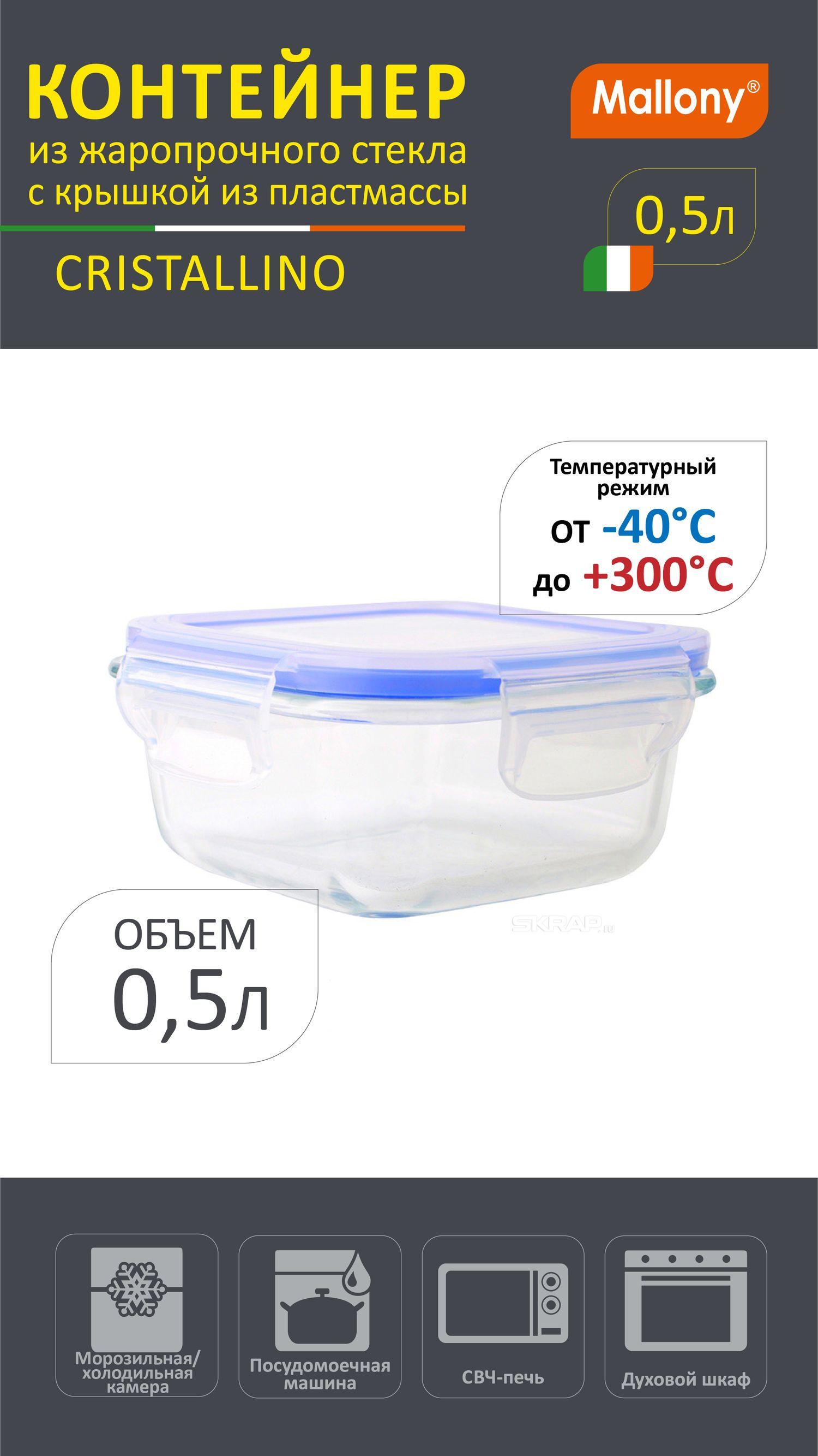 Контейнер CRISTALLINO, 500 мл из жаропрочного стекла с крышкой из пластмассы,темп режим -40 до +300С
