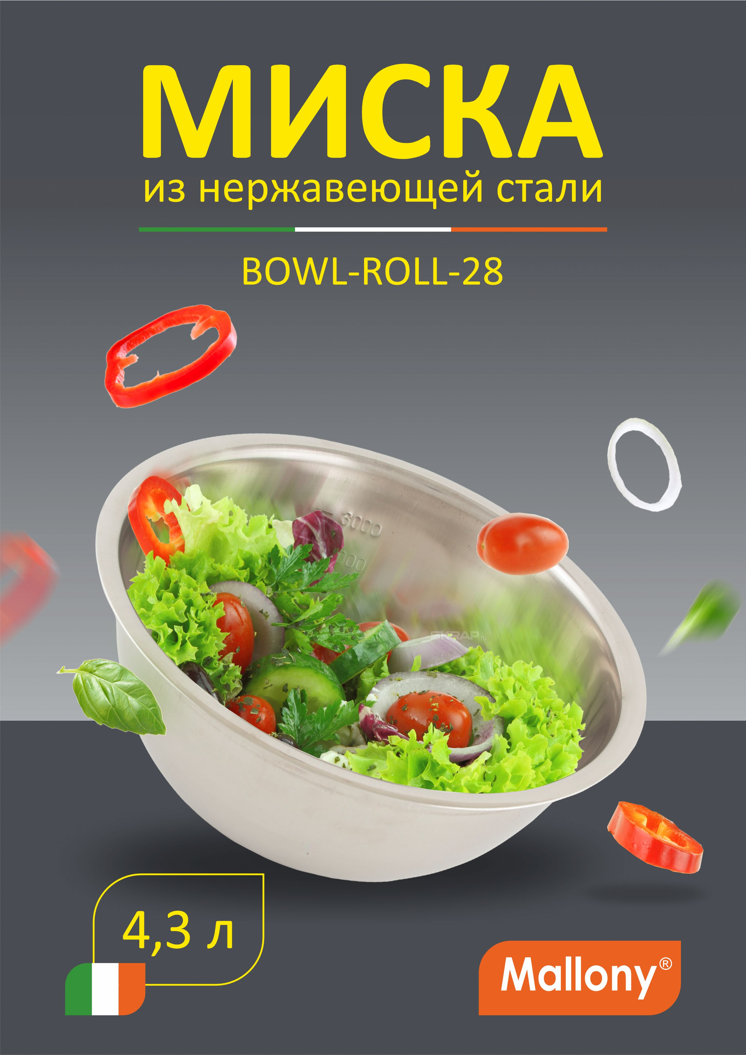 Миска Bowl-Roll-28, объем 4300 мл, из нерж стали, зеркальная полировка, диа 28 см