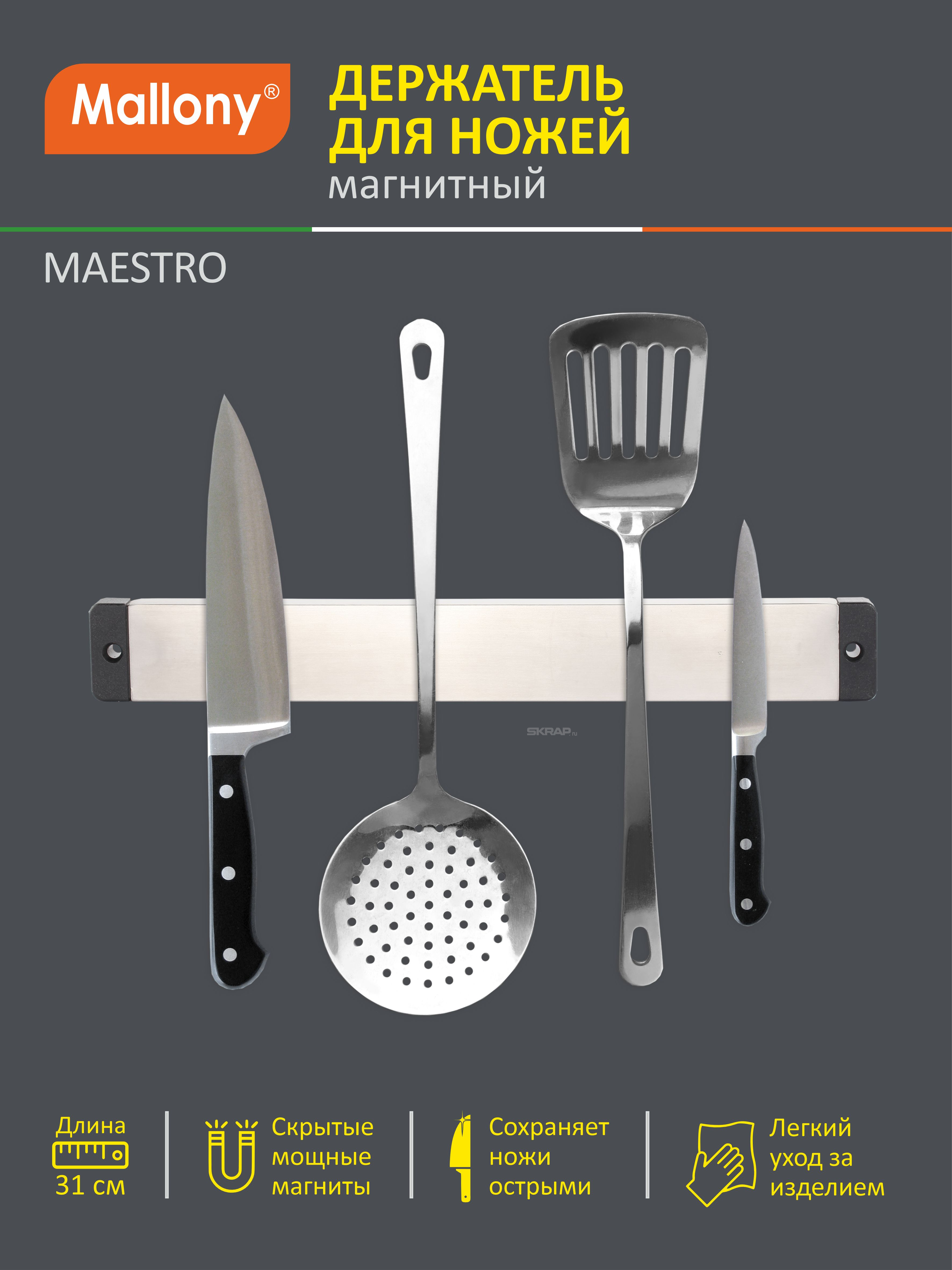 Магнитный держатель для ножей позволяет хранить ножи и другие металлические инструменты на стене, сохраняя пространство на рабочем столе.