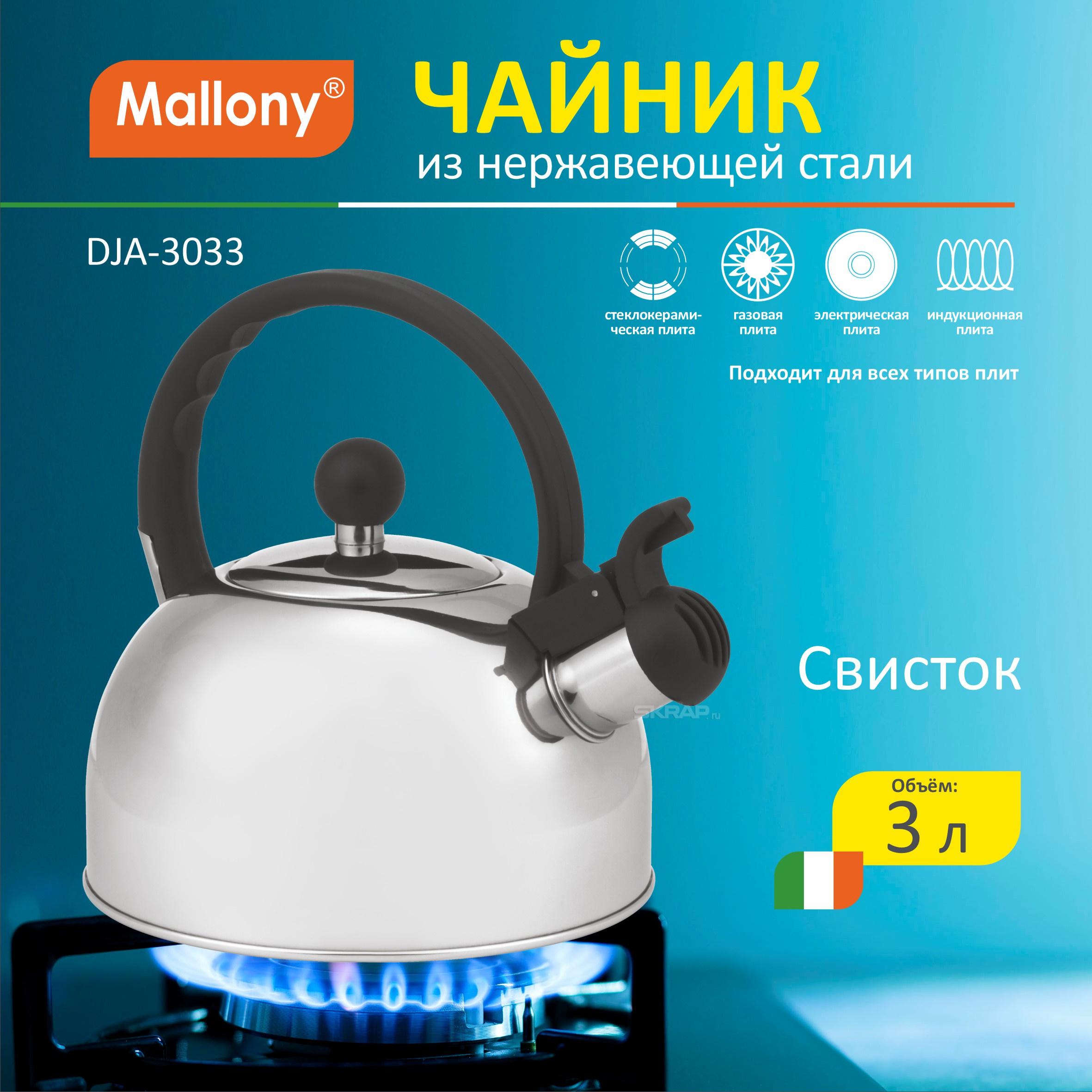 Чайник из нержавеющей стали Mallony DJA-3033 (3,0 литра, со свистком, капсульное дно)